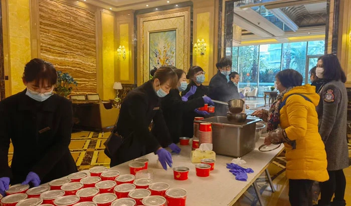 In Golden Dawn, its front-line property management staff started early at 1:00AM to cook the special Laba porridge that contained more than ten nutritional ingredients such as peanuts, red beans, red dates, longans, kidney beans, lotus seeds, gingko nuts, sticky rice, as well as Tibetan highland barley rice specially reserved from the last love spreading activity.