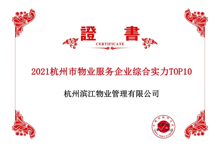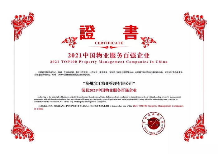 Hangzhou Binjiang Property Management Co., Ltd. was awarded 2021 Top 100 Property Management Companies in China and ranked 17th, 9 places higher than in 2020. It was also ranked the 2nd in comprehensive strength among Hangzhou property service enterprises in 2021. At the same time, Binjiang Jiangnan Star and Binjiang Xixi Star under its management and control won the title of “2021 China Five-Star Property Management Project”.