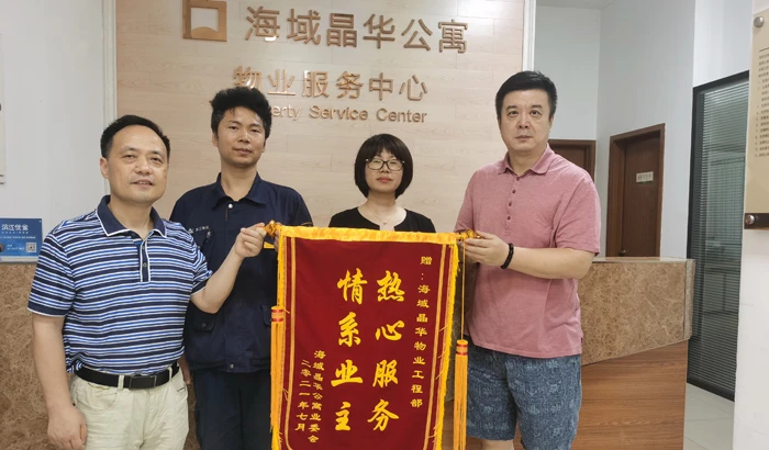 After the success of pipe dredging, the proprietors’ committee of Haiyujinghua, on behalf of all proprietors, sent a silk banner to Binjiang Property to express their appreciation for Binjiang Property’s hard work in the past seven months to keep the residential quarter beautiful and neat, especially for the engineering section’s efforts to solve the long-standing pipe blockage.