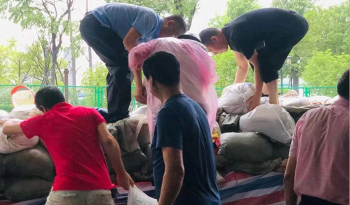 To win the fight against the flood, there must be adequate materials and personnel. At about 9:00, over 100 persons, including more than 30 from Long Shan Guan Di project, 25 from the project of Shangyu area, 20 from Tongsheng Real Estate, 6 from subdistrict community, and over 40 helpful proprietors, were soon gathered. 30 persons sent by the regional branch in Hangzhou also arrived that afternoon.